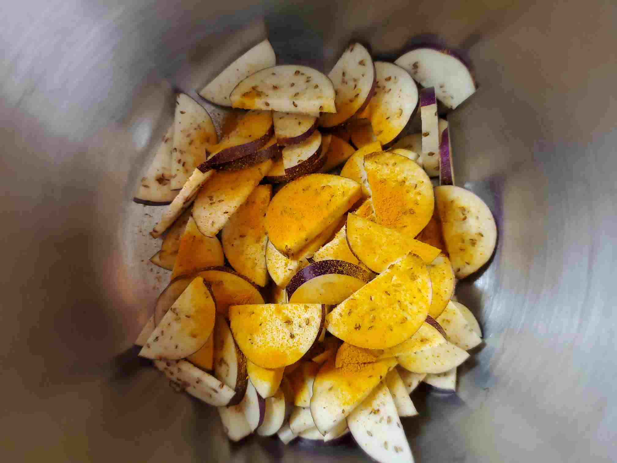 - Sliced eggplant pieces turn brown as they oxidize when in contact with air. Don’t cut all the eggplants at once. Cut them in small batches as you fry them.