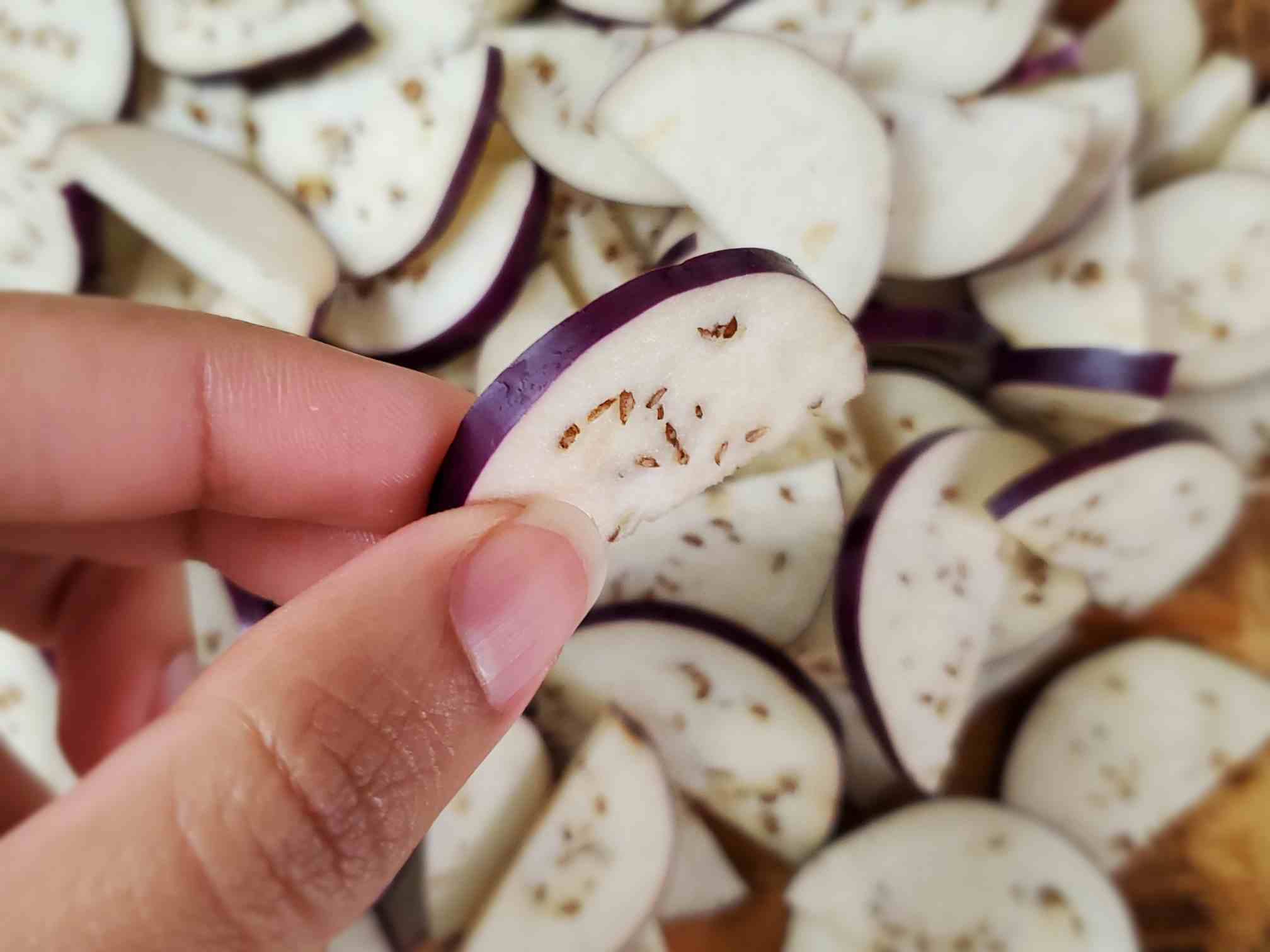 Cut about 500g/ 1lb eggplants into thin half-circles (about 2mm thick).