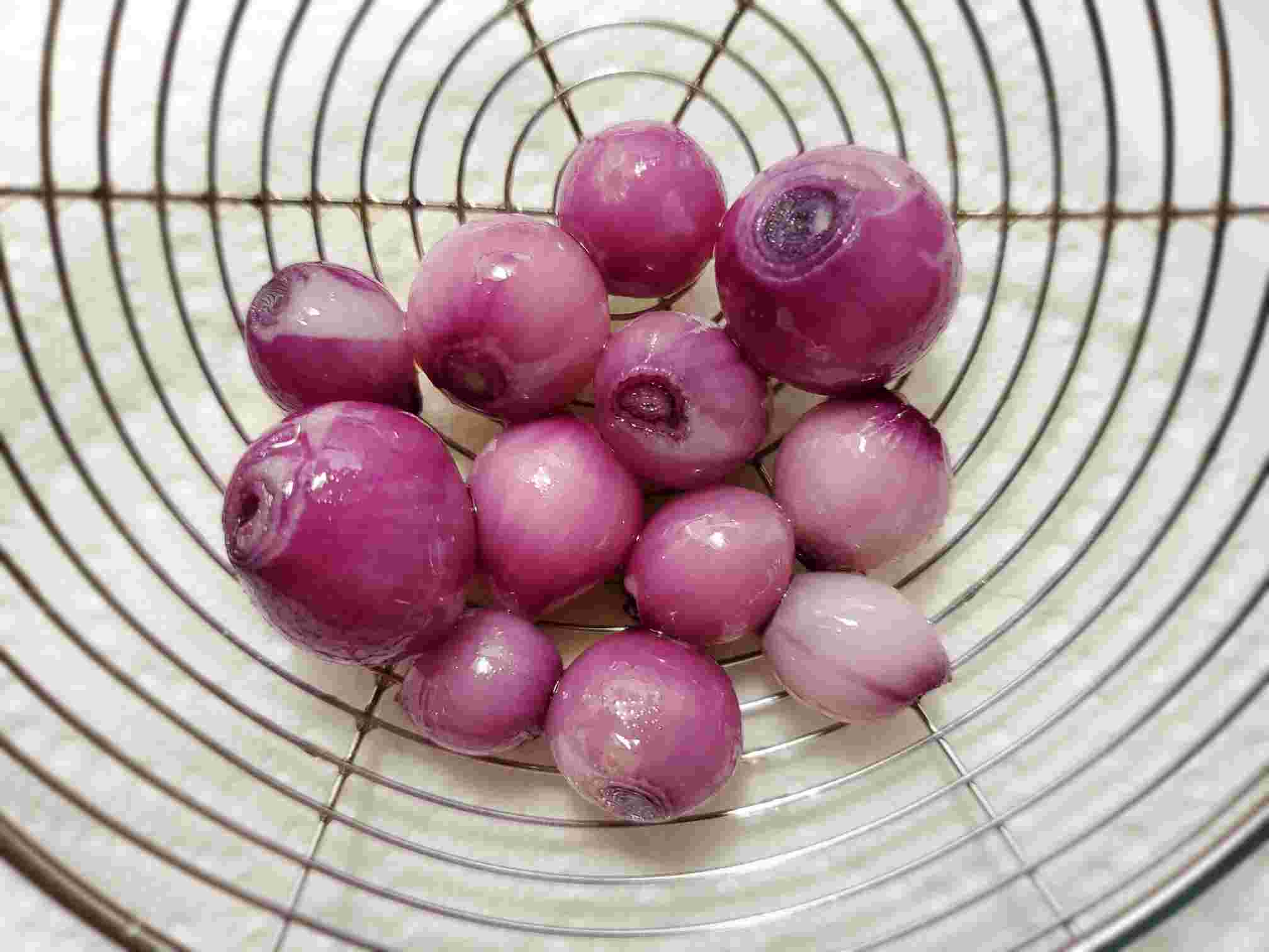 Also oil-blanch your shallots. Means put the shallots into your heated oil and leave it for about 10 seconds and take them out immediately before they turn brown. The color of the Asian shallots/pearl onions would become a little pale.