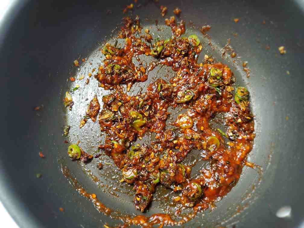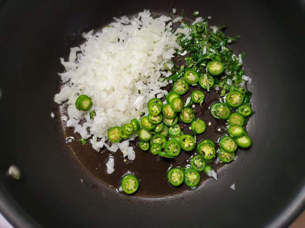 Heat about 1tbsp oil in a pan. Then add your onions, chilies, and curry leaves. Fry the onions until they are golden.