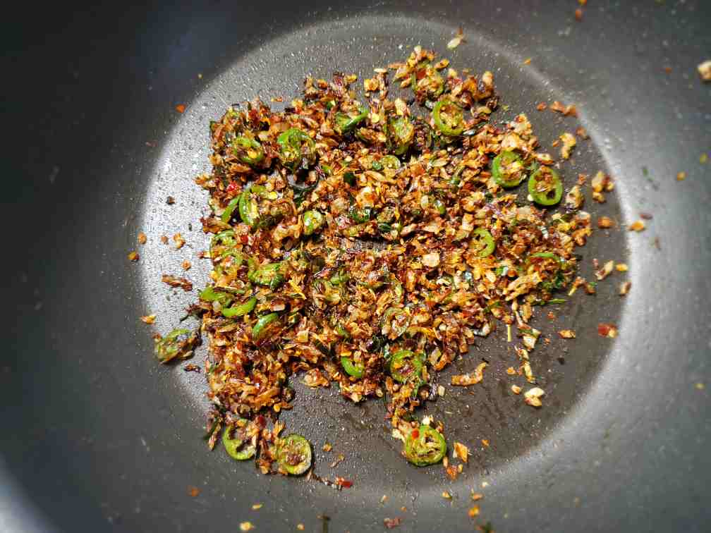 Lower the heat. Then add a generous amount of Maldive fish flakes and chili flakes. Mix with the onions and fry for a few seconds.