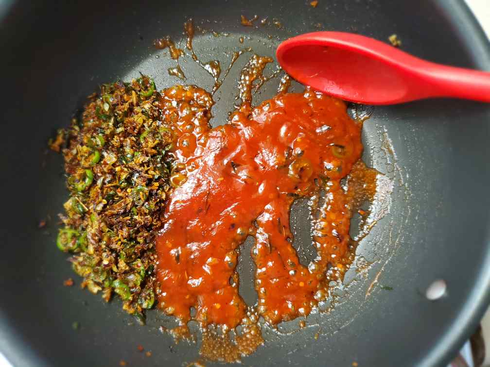 Move everything to a side of the pan and add ketchup, white vinegar sugar, and salt (adjust as per your taste).
