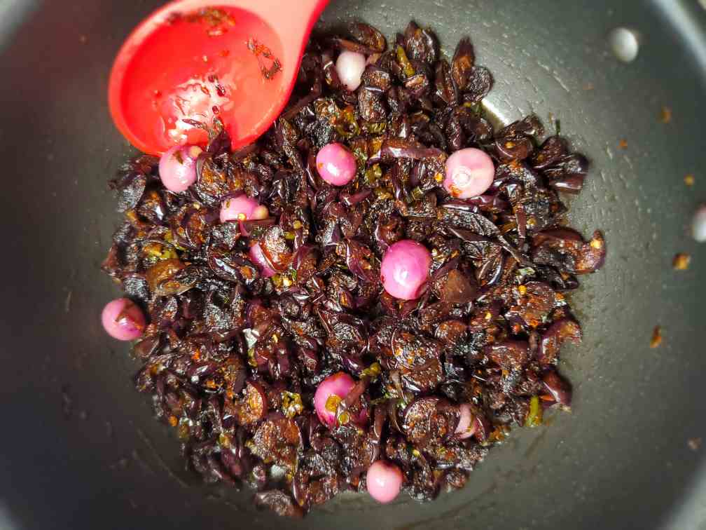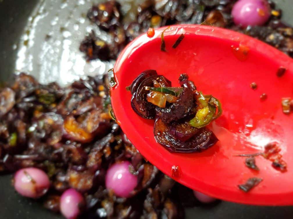 Maldive fish flakes for this eggplant moju is crucial. It adds a nice umami touch to the dish. And also be generous with the amount of curry leaves you put in. They also add nice flavor and aroma.
