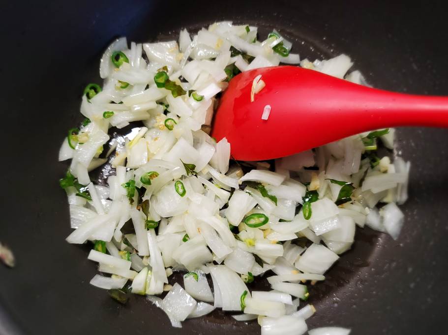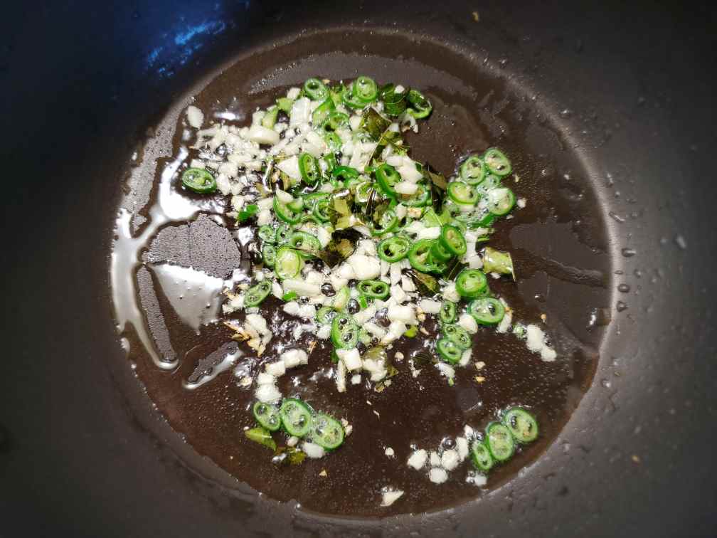 Heat coconut oil in a large saute pan. Add curry leaves. Then add finely chopped garlic and chopped/sliced green chilies. Fry for a few seconds. Do not wait until garlic becomes brown.