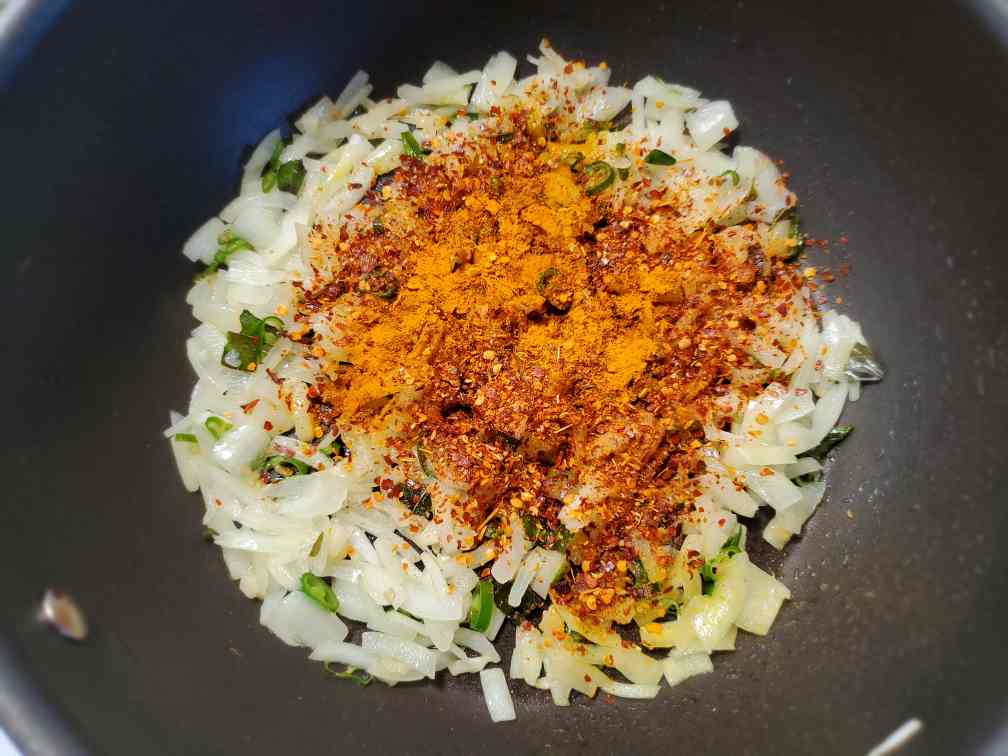 Add chili flakes, turmeric powder, and a bit of salt. Saute. Adjust the chili flakes for your taste