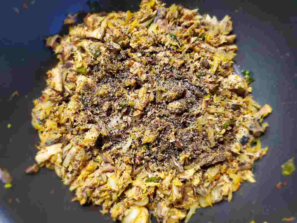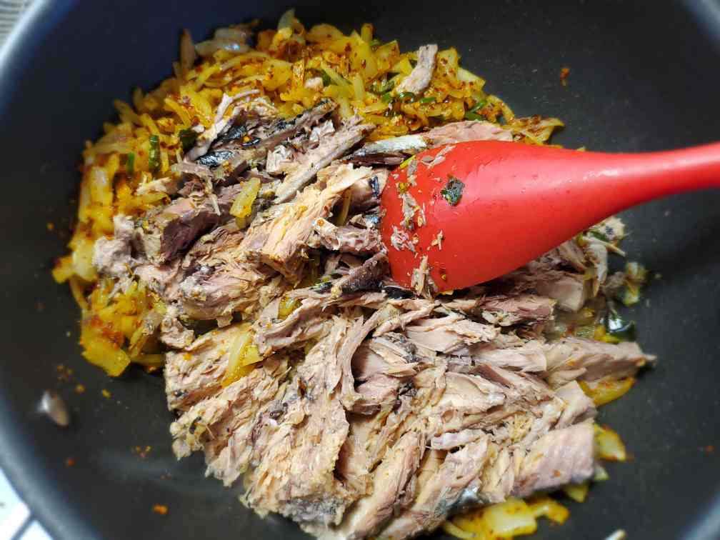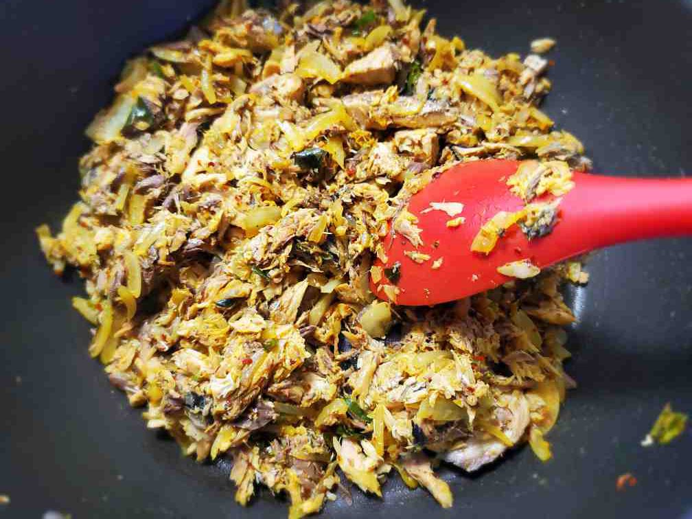 Move the onions to a side of the pan. Add your mackerel (make sure the liquid is completely drained) mash the mackerel pieces using the spatula/spoon.