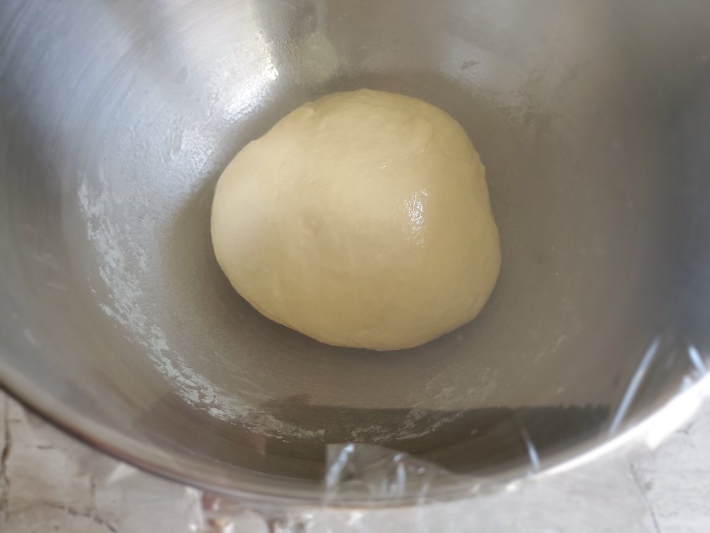 Make the dough into a ball using your hands. Apply some oil to the bowl. Put the dough in. Apply a few drops of oil on the surface of the dough. Cover with plastic wrap.