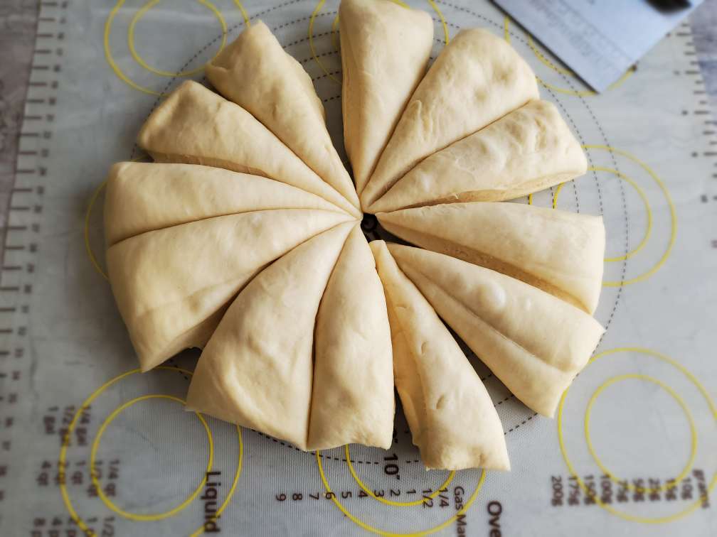 Cut the dough into 12 equal pieces using a bench scraper or a knife.