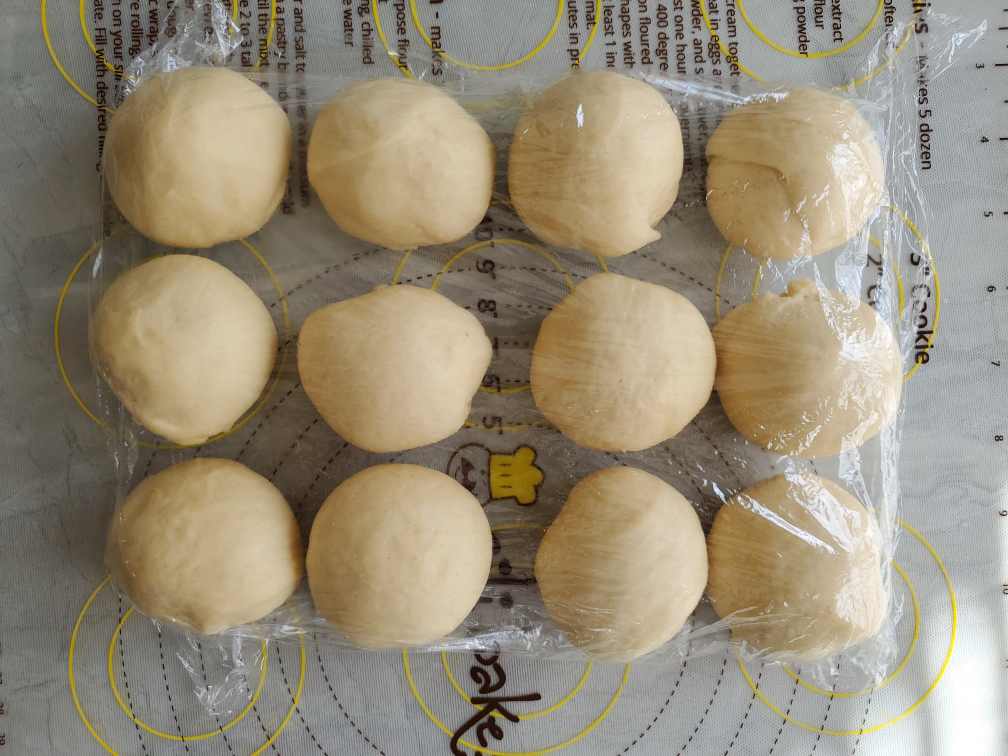 Make them into balls. Roughly about 65g -70 g each. Arrange them on the bench. Cover with a plastic wrap nicely and let them rest for 15mins.