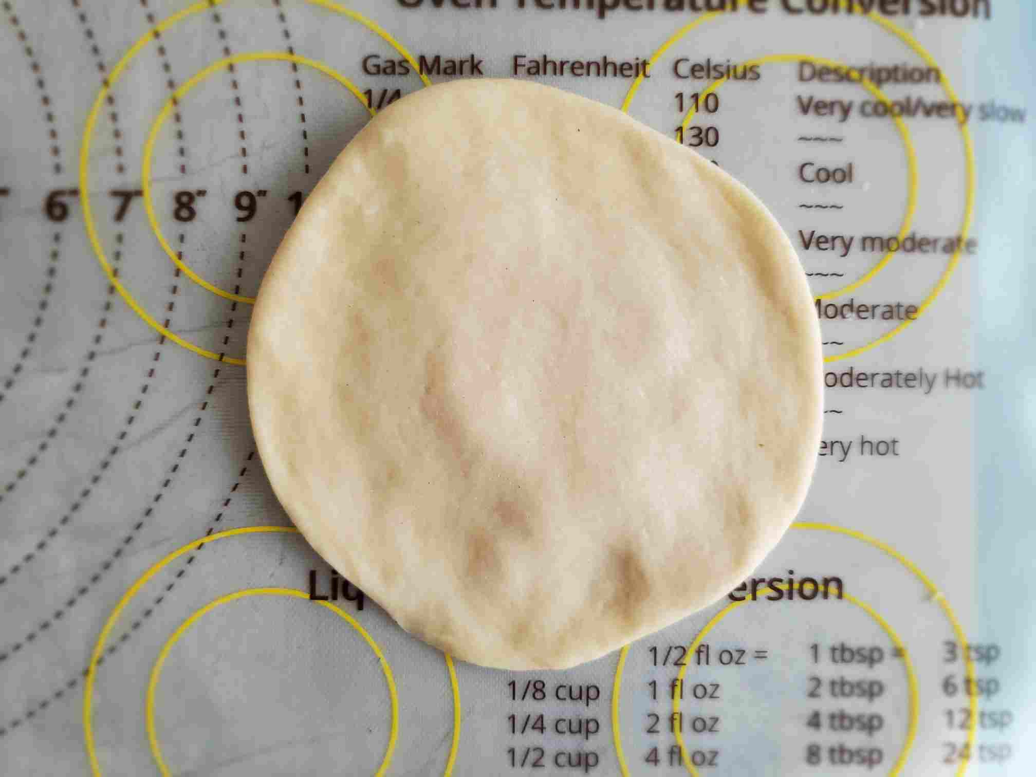 After 15 mins, you'd notice that they've puffed up a little and easy to work with. Take one ball out. Keep the rest of them covered all the time. Flatten it out with your hands until it's about 5 - 6 inches in diameter. Make sure the middle is slightly thicker than the edges. So buns nicely dome up in the middle when they bake.