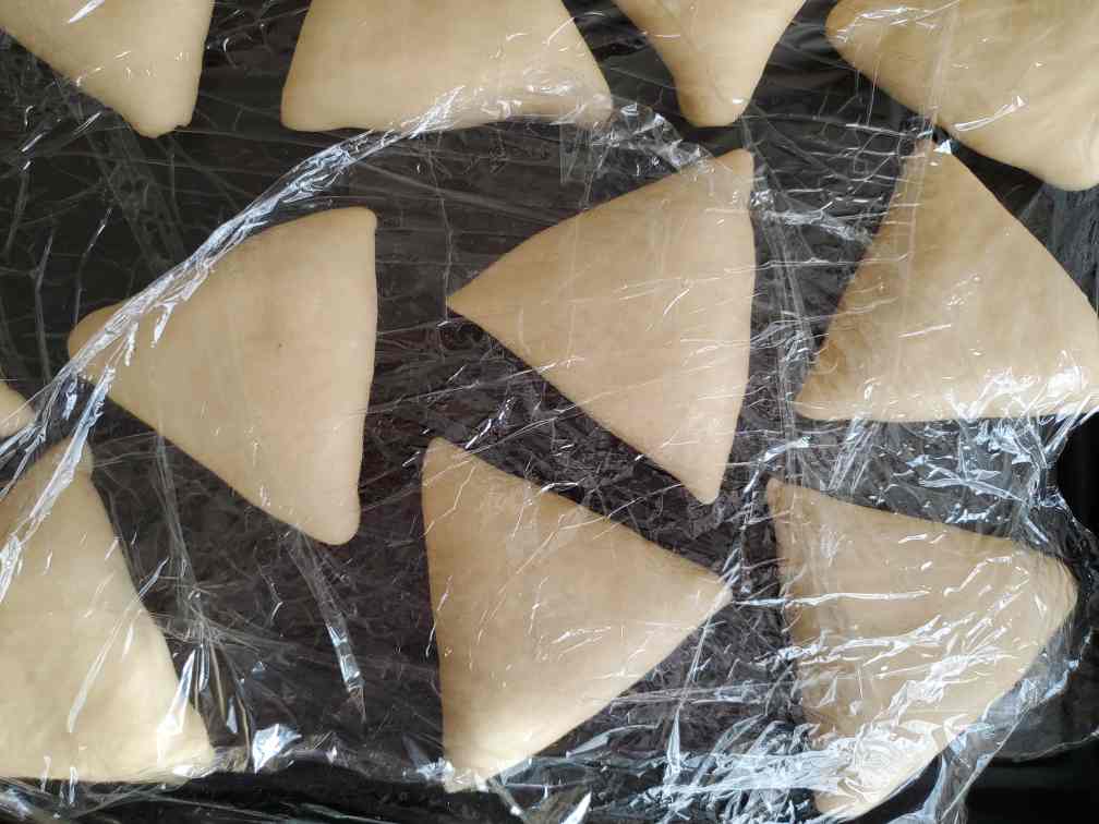 Arrange on a large baking sheet and cover with plastic wrap so it wouldn't dry out. Always keep all the dough pieces covered so they don't dry out and harden the surface. Repeat the process to all the dough balls and arrange the triangles on the baking sheet. Make sure to leave plenty of space between each triangle so they have enough space to rise up and wouldn't stick together in the oven as they puff up in the oven. Let them rise again until they become double in size. This time it would take relatively less time to rise up. (around 30 - 45mins) Do not overproof/wait too long, they'd collapse in the oven.