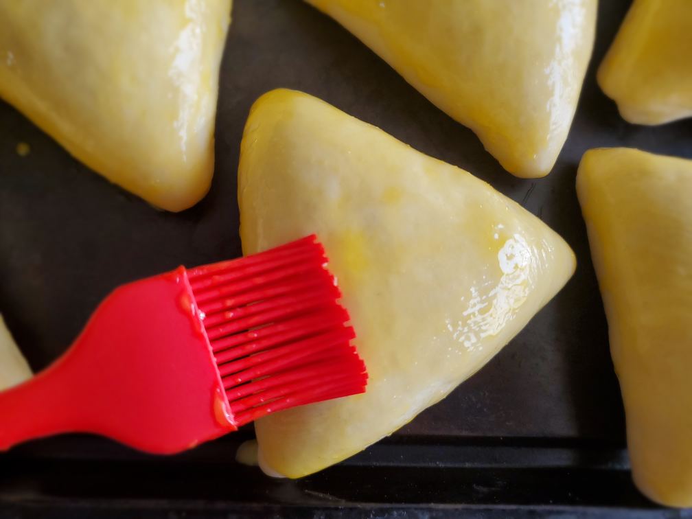 Mix egg yolk and milk together to make the egg wash. When the triangles are doubled in size, apply the egg wash using a pastry brush or a silicone brush.