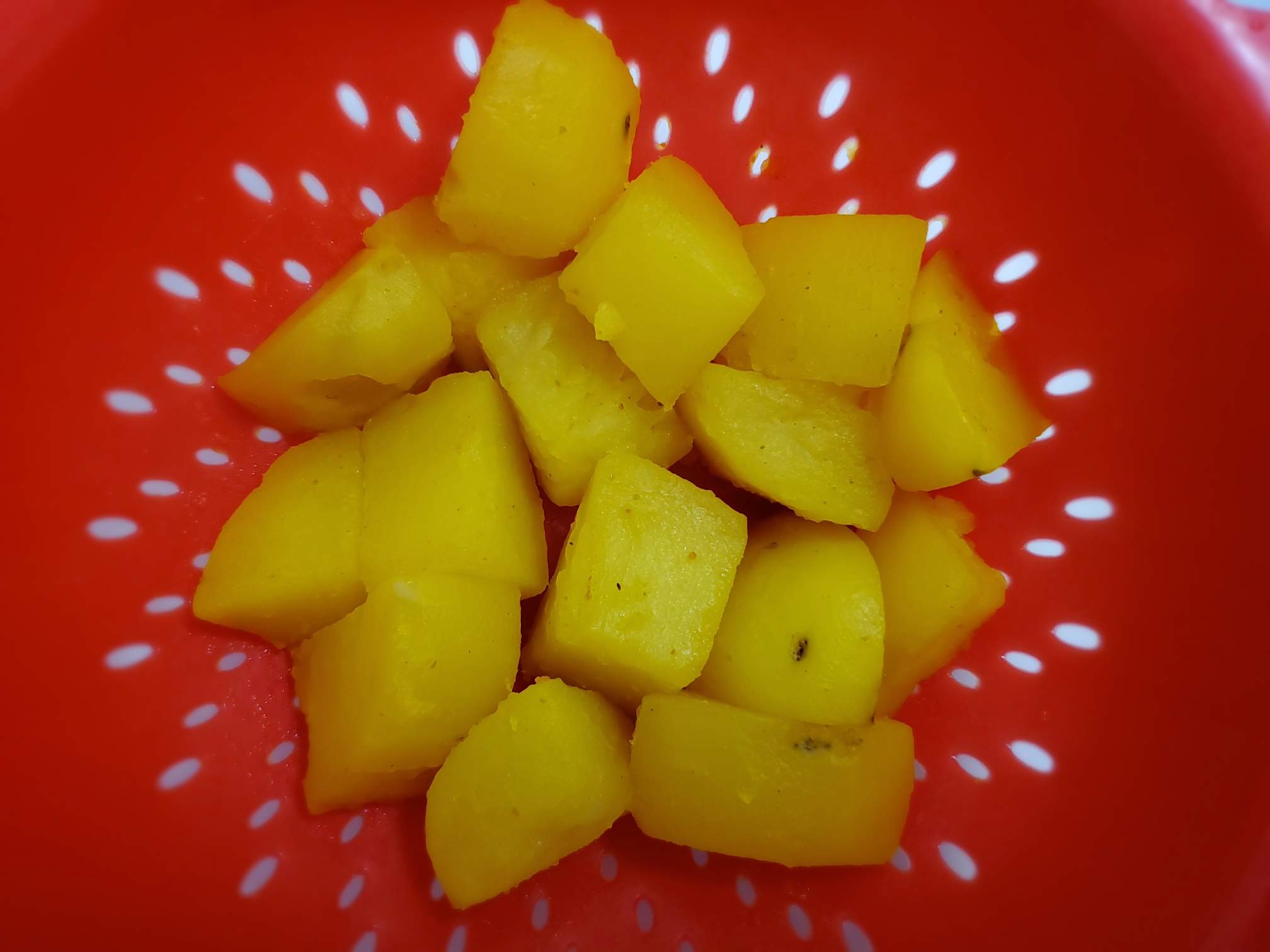 Boil potatoes with ¼ tsp turmeric and ½ tsp salt. Drain when the potatoes are fork-tender and then leave them to cool down and dry out. Do not boil potatoes until they become mushy.