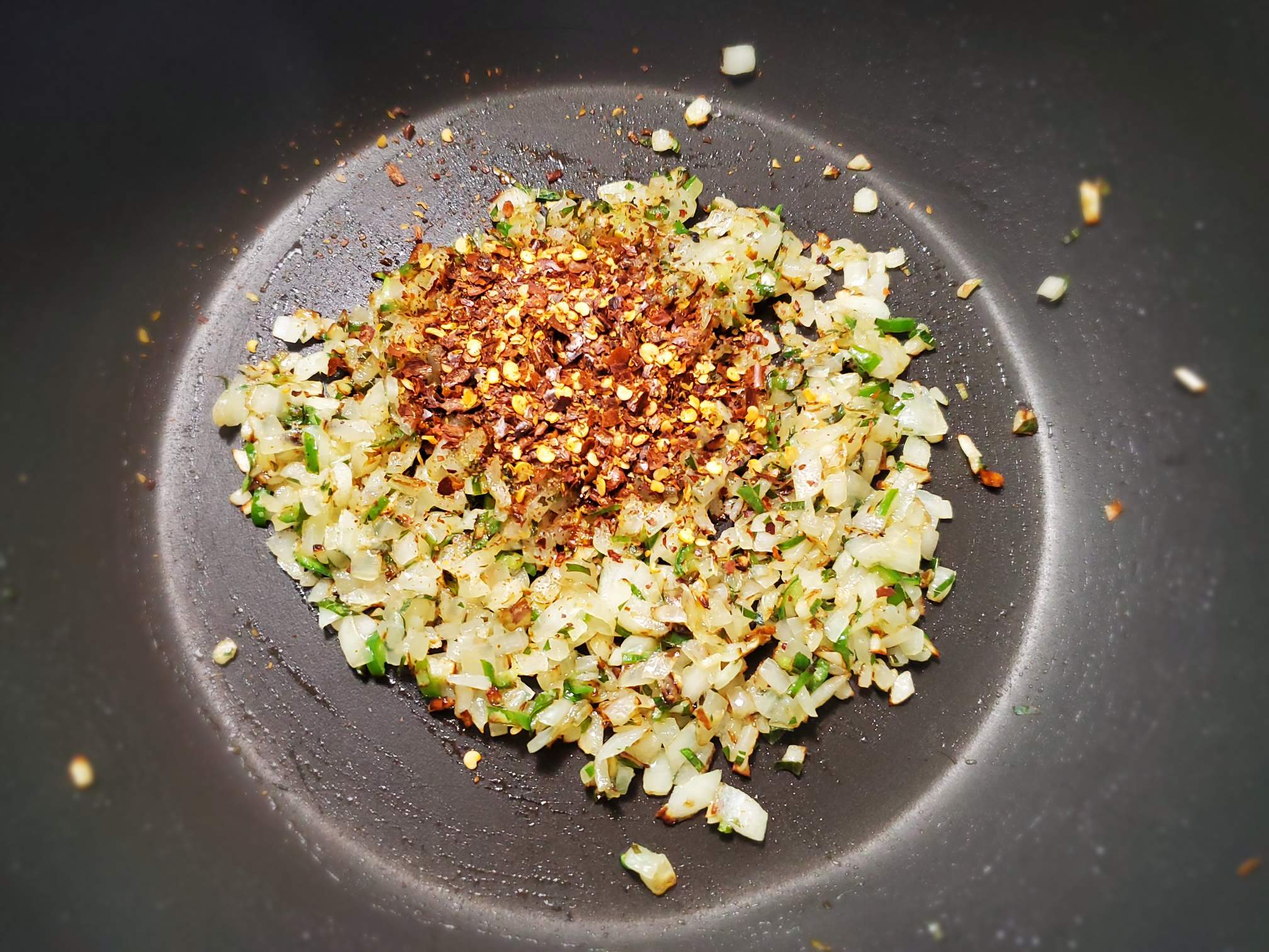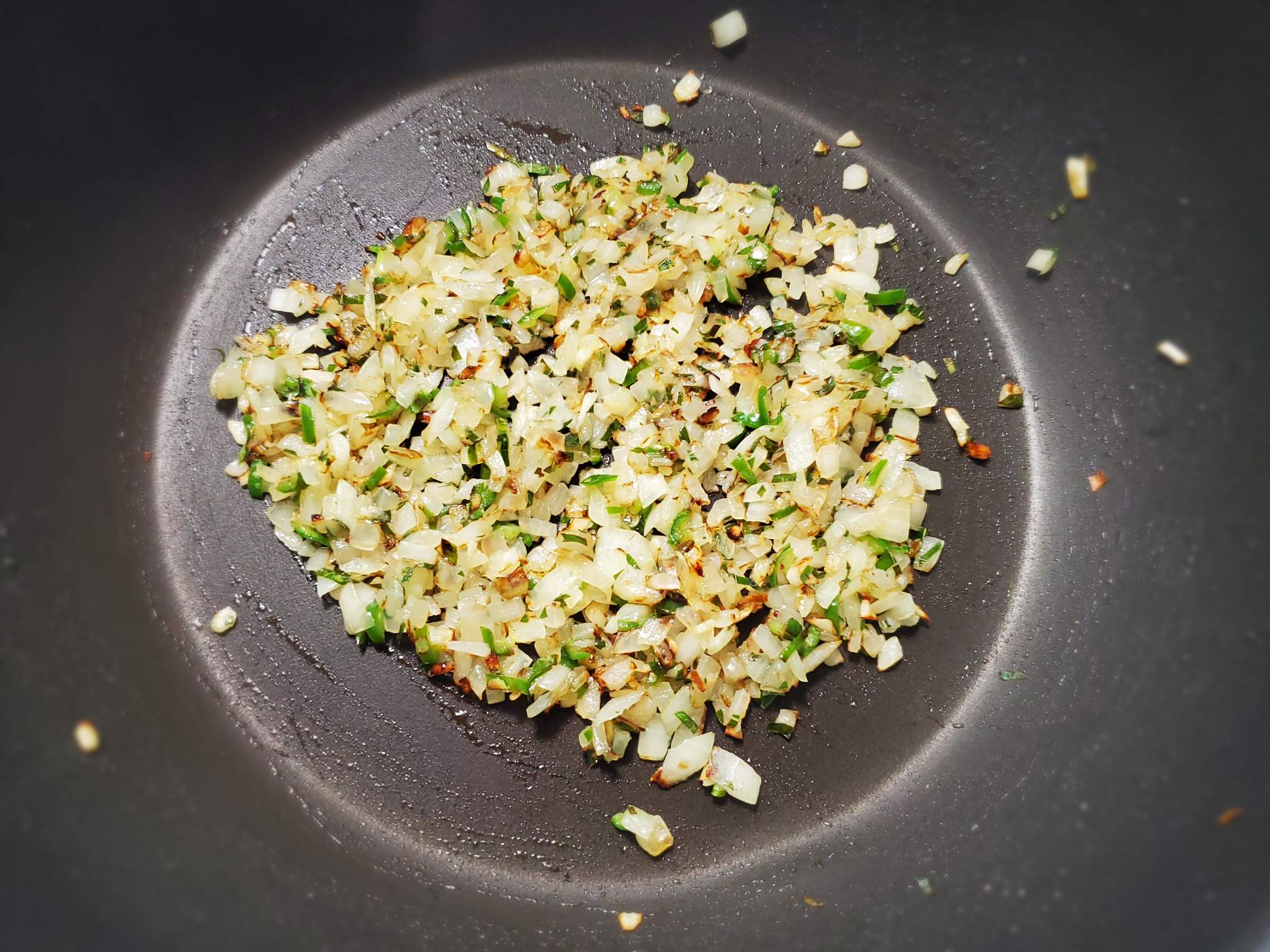 Heat 2 tsp oil. Add garlic, curry leaves, onion, and green chili. Make sure everything is finely chopped. Fry everything on medium heat until the onions become soft and dry.