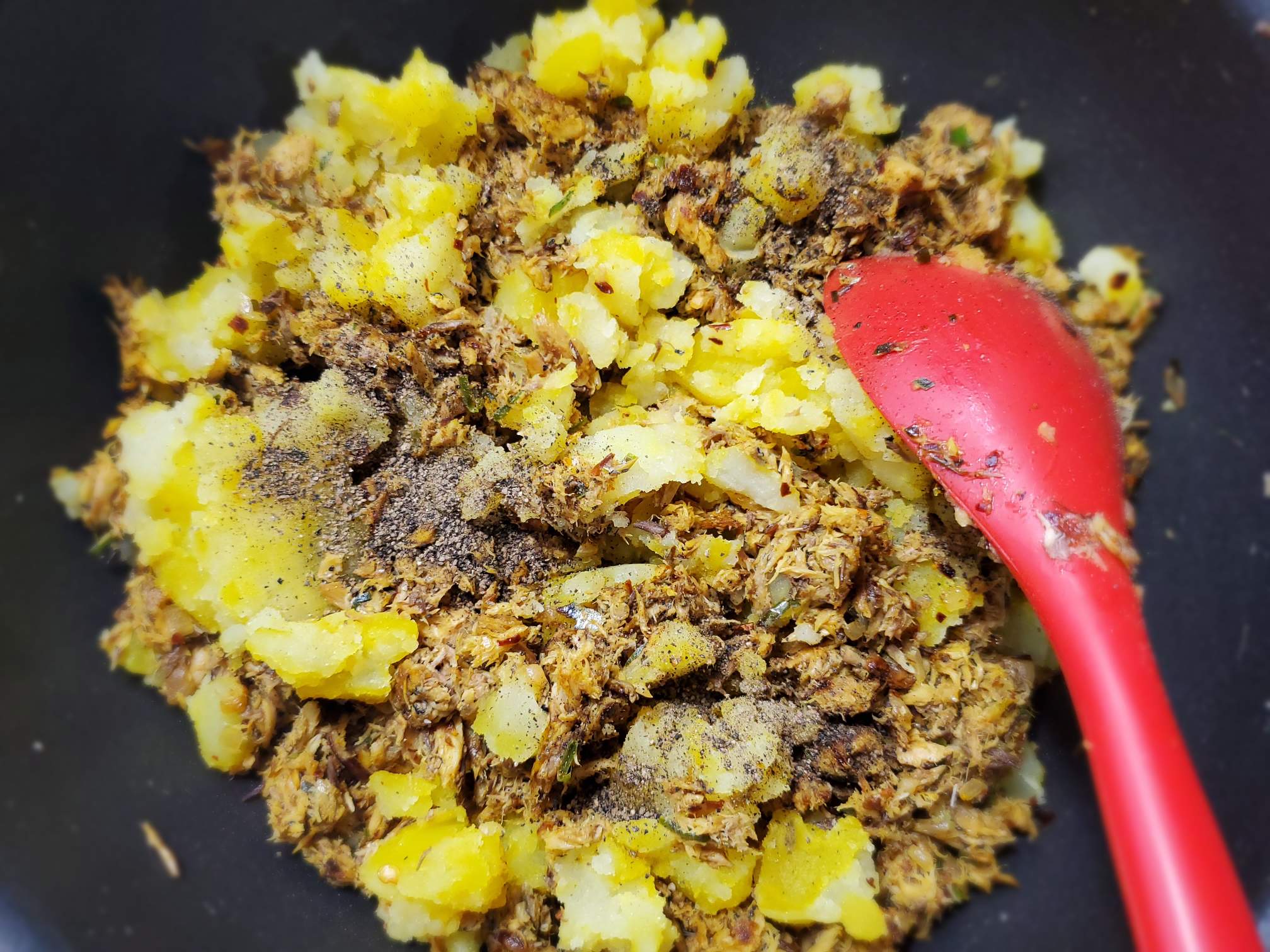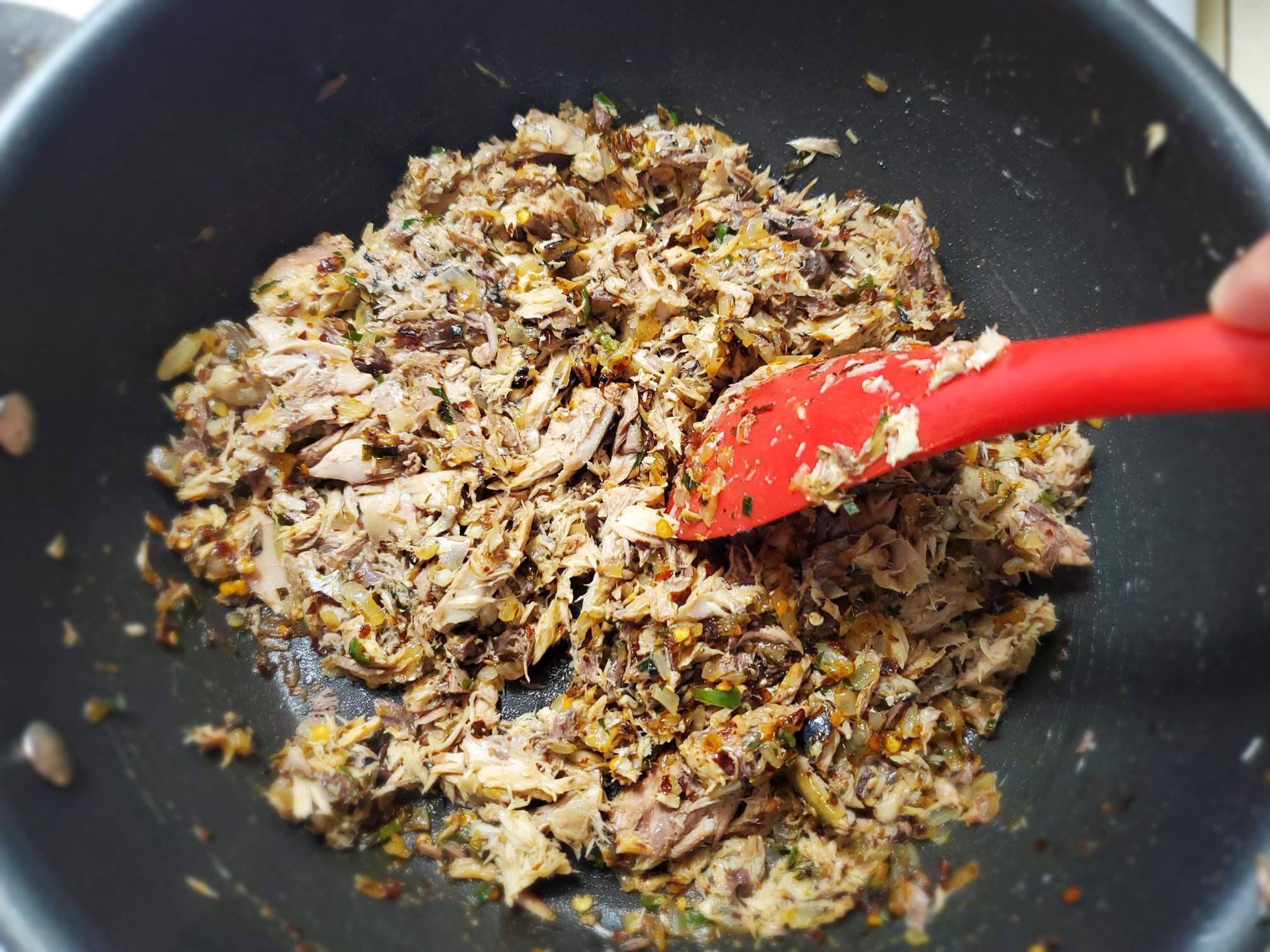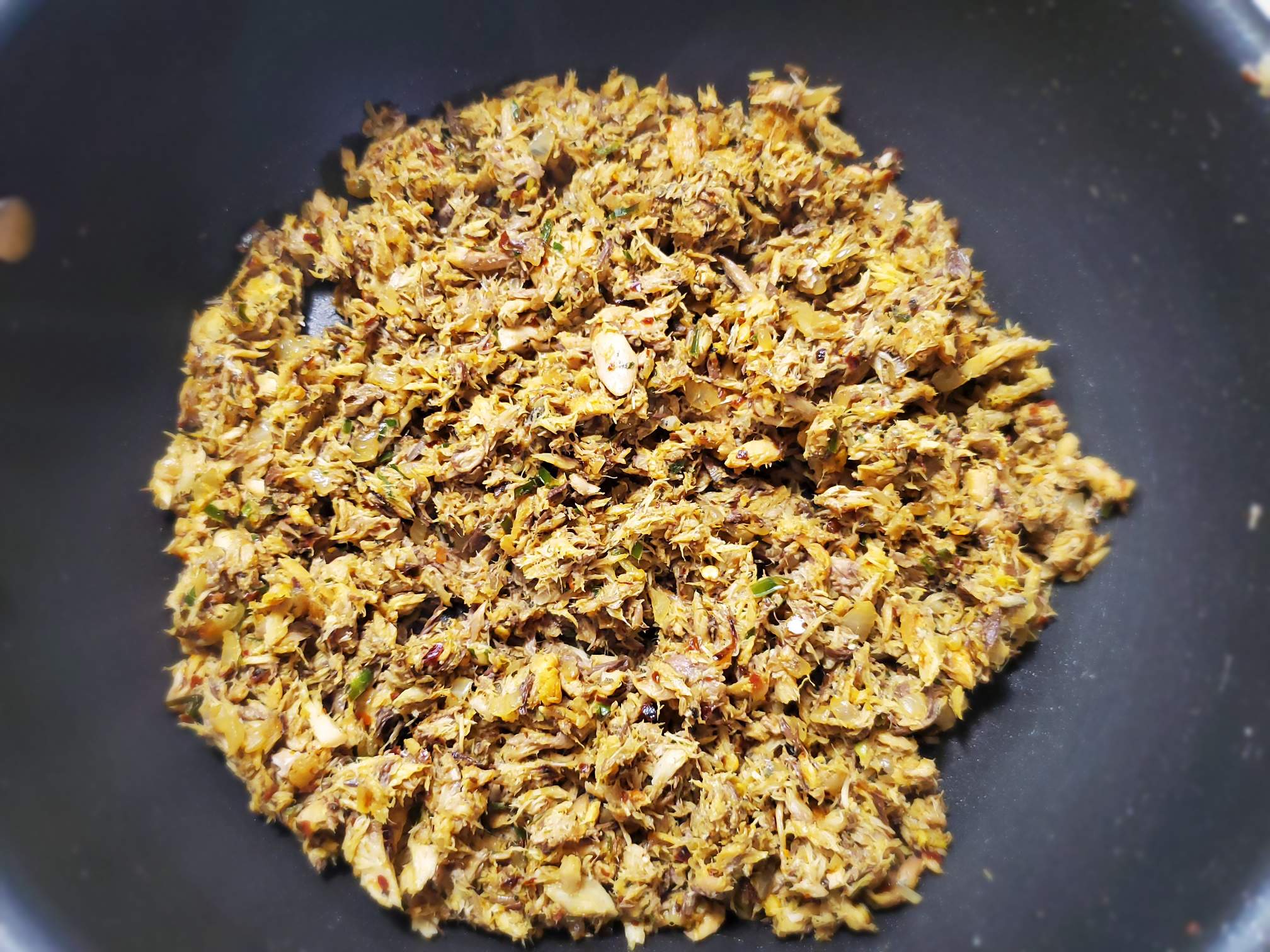 Move everything aside and add the mackerel can (completely drained) Mash them with your spoon until there are no chunks left. Alternatively, you can mash them before you add them to the pan too.