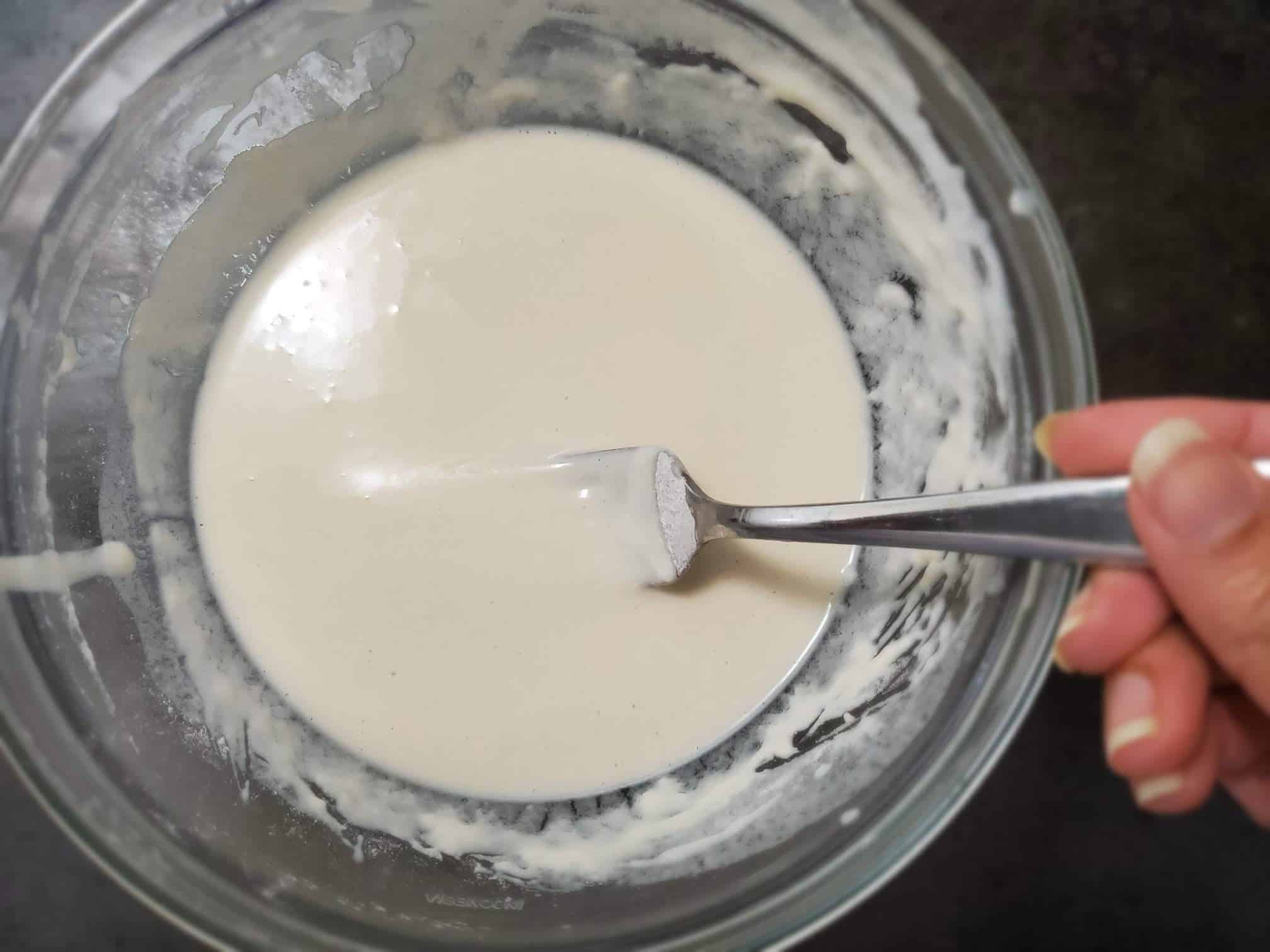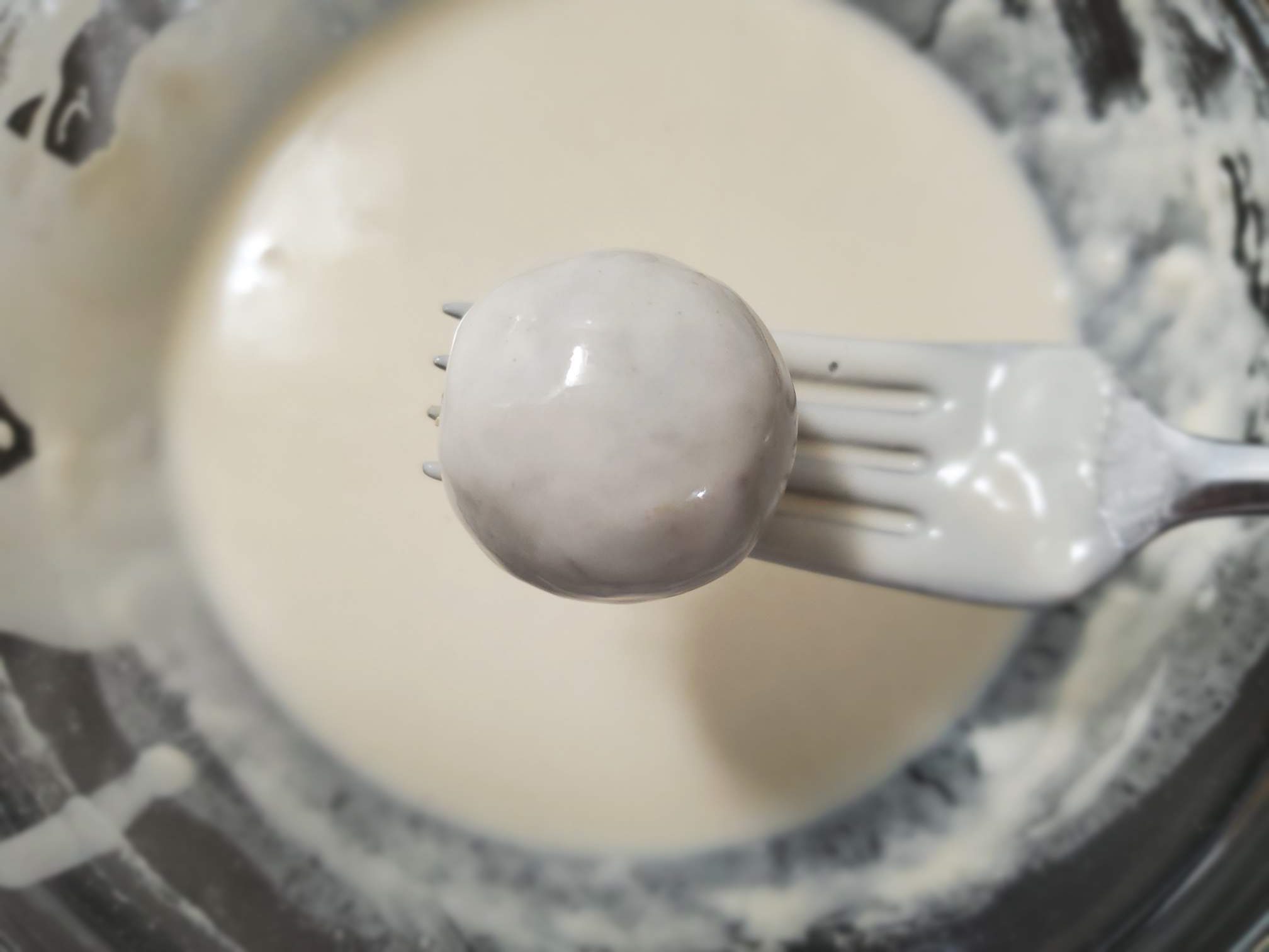 Now dip one ball at a time in the batter. Use a fork to easily handle. Hold the cutlet over the mixture for a few seconds so the excessive batter can drip down.