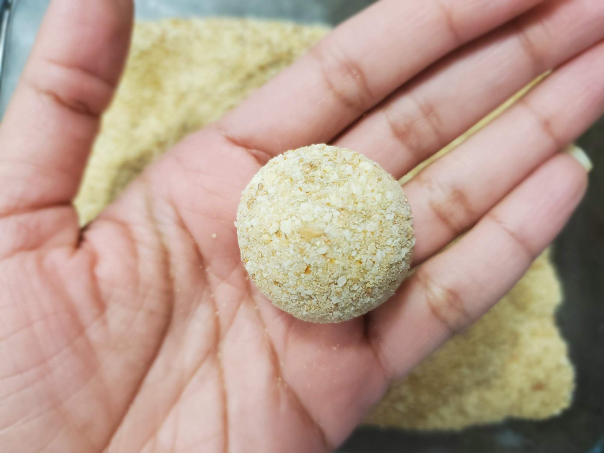 When the mixture is cooled down, take 2-3 tbsp of the cutlet mixture (depending on how big or small you want) at a time and make them into small cutlet balls. Make sure the surface of the cutlet ball is smooth. (read the description for more info). Arrange them on a plate.