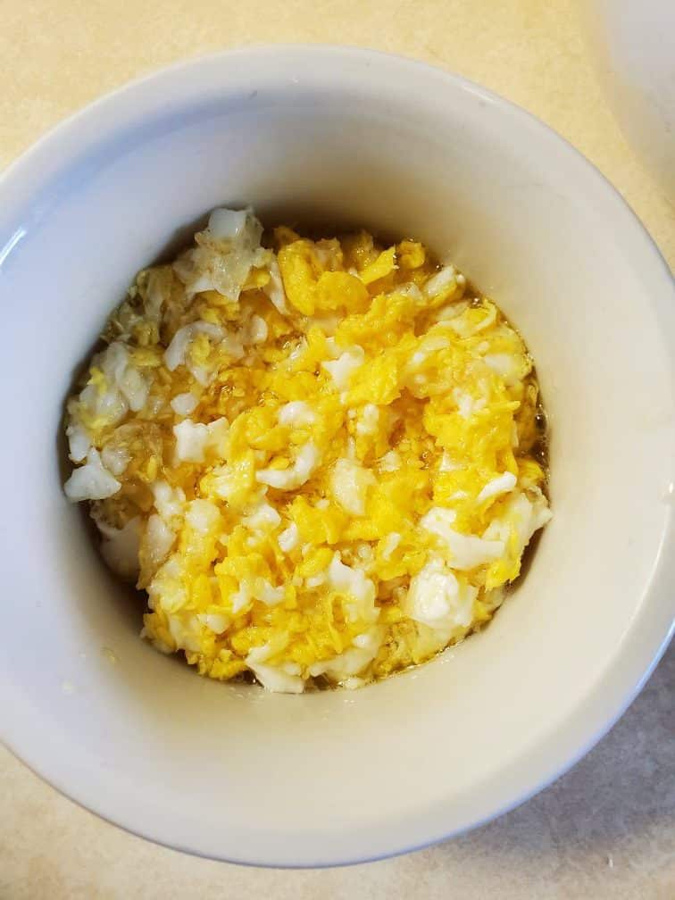 Meanwhile, add a generous amount of oil to your hopper pan. Let the oil heat a bit and then add an egg yolk if your pan is too sticky. ( Or you can use the whole egg if your pan is old and well seasoned) break the egg yolk in the oil as it frying and rub it all in the pan using your spoon. Then remove the oil and the egg yolk to a heatproof bowl. We are going to use this oil to rub the pan before making each hopper. **Skip this step completely if you're using a nonstick hopper pan.