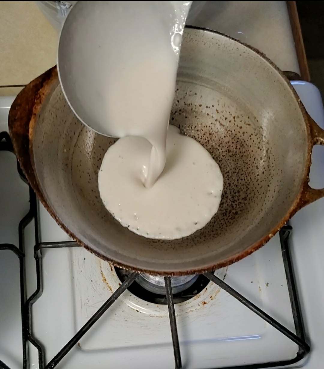 Heat the hopper pan on medium heat, add a ladle full of batter to the center. and swirl the pan around to coat the inside with the batter. Now cover the pan and let it cook for about 45 seconds or until it's done.