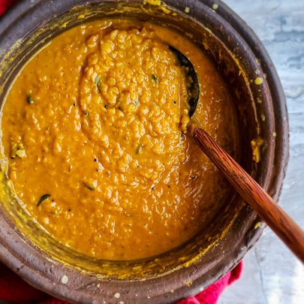 This Sri Lankan spicy red lentil curry goes so well with Sri Lankan Yellow Rice, ghee rice, String hoppers, coconut roti (flatbread), and even with butter naan.